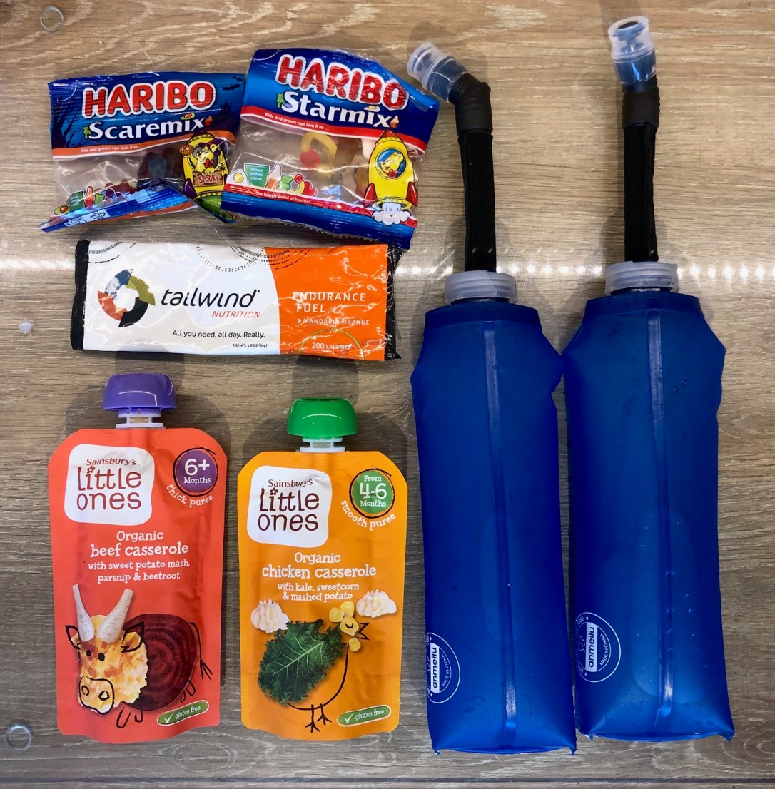 I ate well the day before the long run, and made sure I was properly hydrated; I also ate a sizeable bowl of porridge the next morning. Both collapsible water bottles were filled with the right amount of Tailwind, and two pouches of baby food as well as some Haribo were packed into the ultra vest.