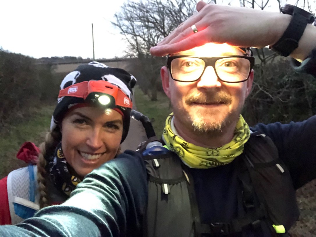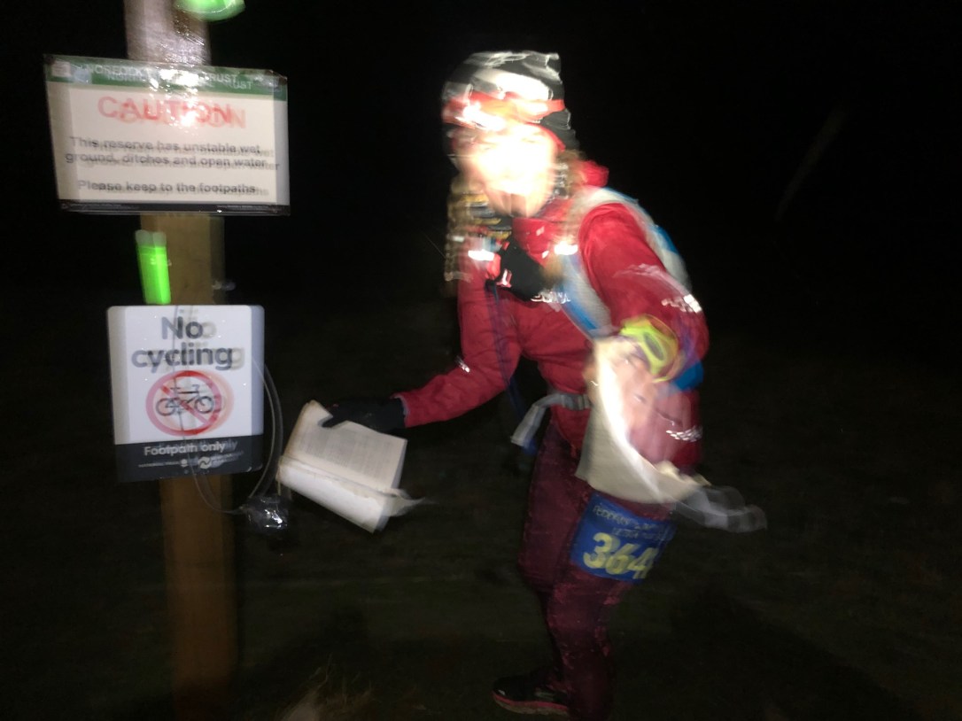 So, the final approximate 14 miles from checkpoint 3: this is where things got tough. Martin, Lisa and I made quite a team by giving each other loads of encouragement. Poor light to pitch black set in very quickly, and with head torches, we pressed on with the tough bit. In order to make sure we kept covering ground, and given the muddy, unstable trail and pitch black conditions, we agreed to bursts of 90 seconds of running, punctuated with power-walks. This worked well. About 5 miles from the coast we hooked up with a lady who was running alone, who decided to stick with our regime until about a mile from the coast.