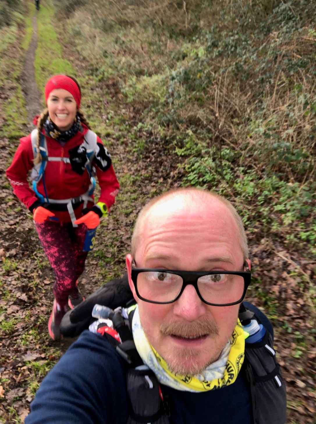 It was on leaving this checkpoint that we took stock of how we were all feeling. As we ran, Lisa told me that an old ankle issue had resurfaced. I asked her how painful it was on a scale of 1 to 10. Lisa said it was about an 8! This says all you need to know about Lisa! Ever smiling, she will not allow something like serious pain to stop her running a further 21 miles having already ran over the marathon distance on muddy, uneven trail! Martin had little to report on the problems front other than some stiffness in his legs. My problems were to make themselves known at around mile 32, at which point we found ourselves at the bottom of a long hill. I had eaten and hydrated very well the day before, and, having recalled the issues I had experienced last year, I snacked well in the early stages of this race. At the checkpoint we had just left, I took full advantage of the amazing soup on offer, I dipped a jam sandwich into mine! It was OK! For whatever reason , as we climbed the hill, I developed tunnel vision, and broke into a serious sweat that seemed unrelated to the effort at hand. I had to eat some fish paste sarnies (don’t judge me), as well as some dry roasted peanuts, and I necked some flat Lucozade. It is hard to tell which of these medicines sorted me out: maybe it was all three, but I recovered swiftly and soon we were on our way again.