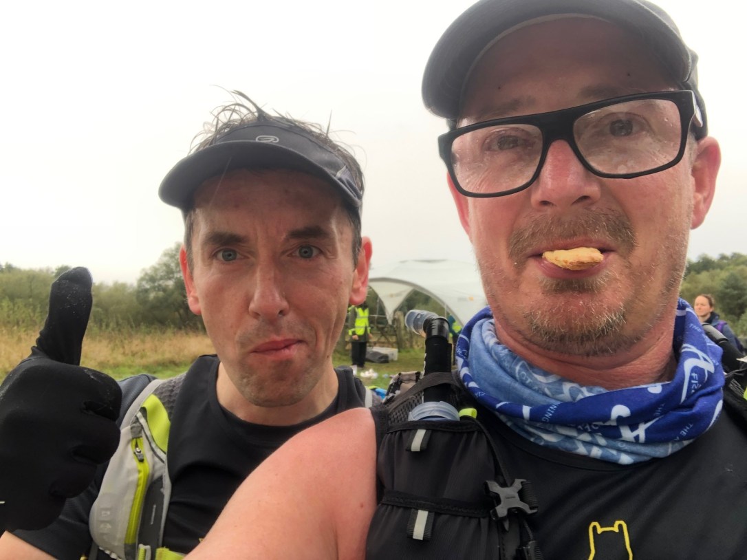 It was on leaving this checkpoint that we took stock of how we were all feeling. As we ran, Lisa told me that an old ankle issue had resurfaced. I asked her how painful it was on a scale of 1 to 10. Lisa said it was about an 8! This says all you need to know about Lisa! Ever smiling, she will not allow something like serious pain to stop her running a further 21 miles having already ran over the marathon distance on muddy, uneven trail! Martin had little to report on the problems front other than some stiffness in his legs. My problems were to make themselves known at around mile 32, at which point we found ourselves at the bottom of a long hill. I had eaten and hydrated very well the day before, and, having recalled the issues I had experienced last year, I snacked well in the early stages of this race. At the checkpoint we had just left, I took full advantage of the amazing soup on offer, I dipped a jam sandwich into mine! It was OK! For whatever reason , as we climbed the hill, I developed tunnel vision, and broke into a serious sweat that seemed unrelated to the effort at hand. I had to eat some fish paste sarnies (don’t judge me), as well as some dry roasted peanuts, and I necked some flat Lucozade. It is hard to tell which of these medicines sorted me out: maybe it was all three, but I recovered swiftly and soon we were on our way again.